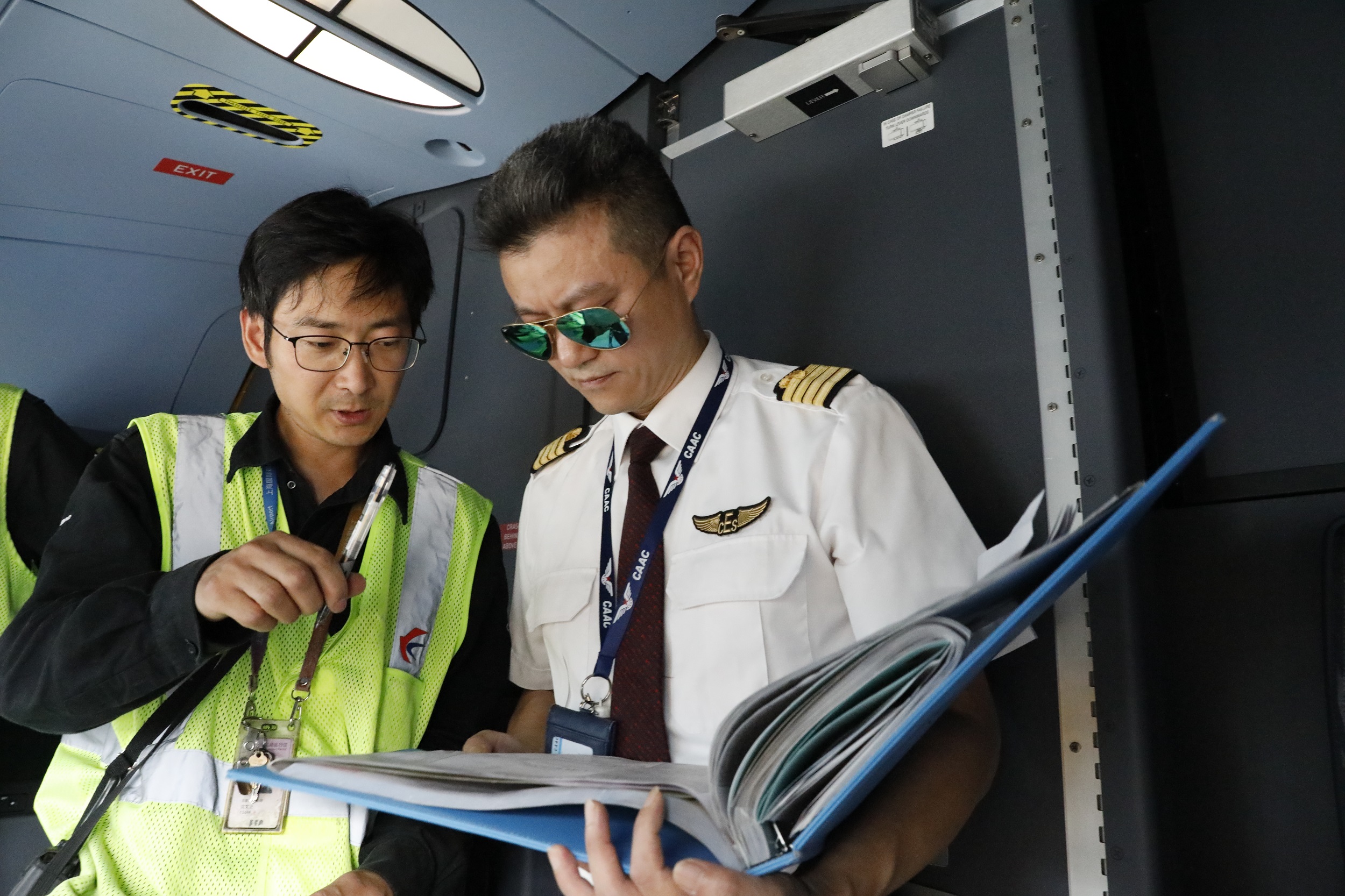 航班起飛前,機(jī)務(wù)工程師與東航A350機(jī)長(zhǎng)季紅華進(jìn)行最后的工作交接與確認(rèn)