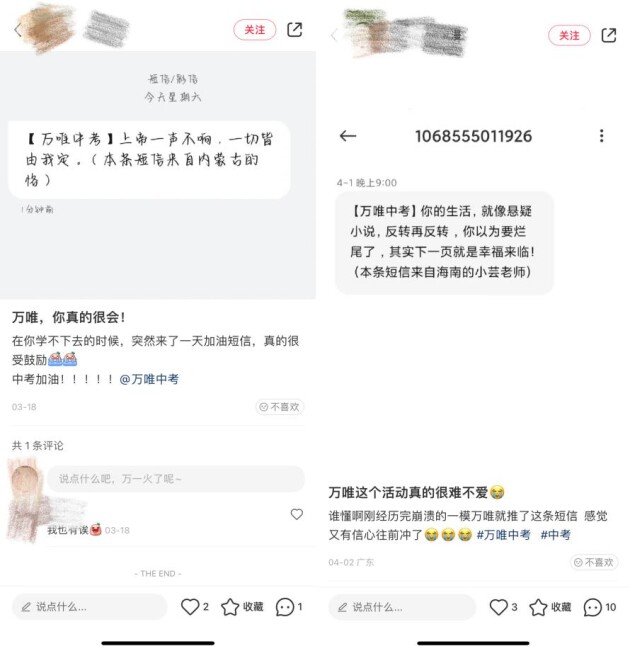 為幫助中考生做好考前心理調(diào)整,平衡心態(tài)、緩解壓力,同時給他們加油鼓勁,從考前100天開始,萬唯每周給志愿報名的學(xué)生發(fā)送加油短信,鼓勵他們堅韌、積極、自信地備考。