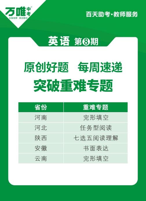 為使師生在中考前更加精準(zhǔn)、高效地備考,3月15日—6月9日期間,萬唯中考持續(xù)為河南、河北、陜西、安徽、云南5省區(qū)初三師生推送七科原創(chuàng)好題等資料,截至目前,已有超3萬名老師每周通過所在的微信群獲取。