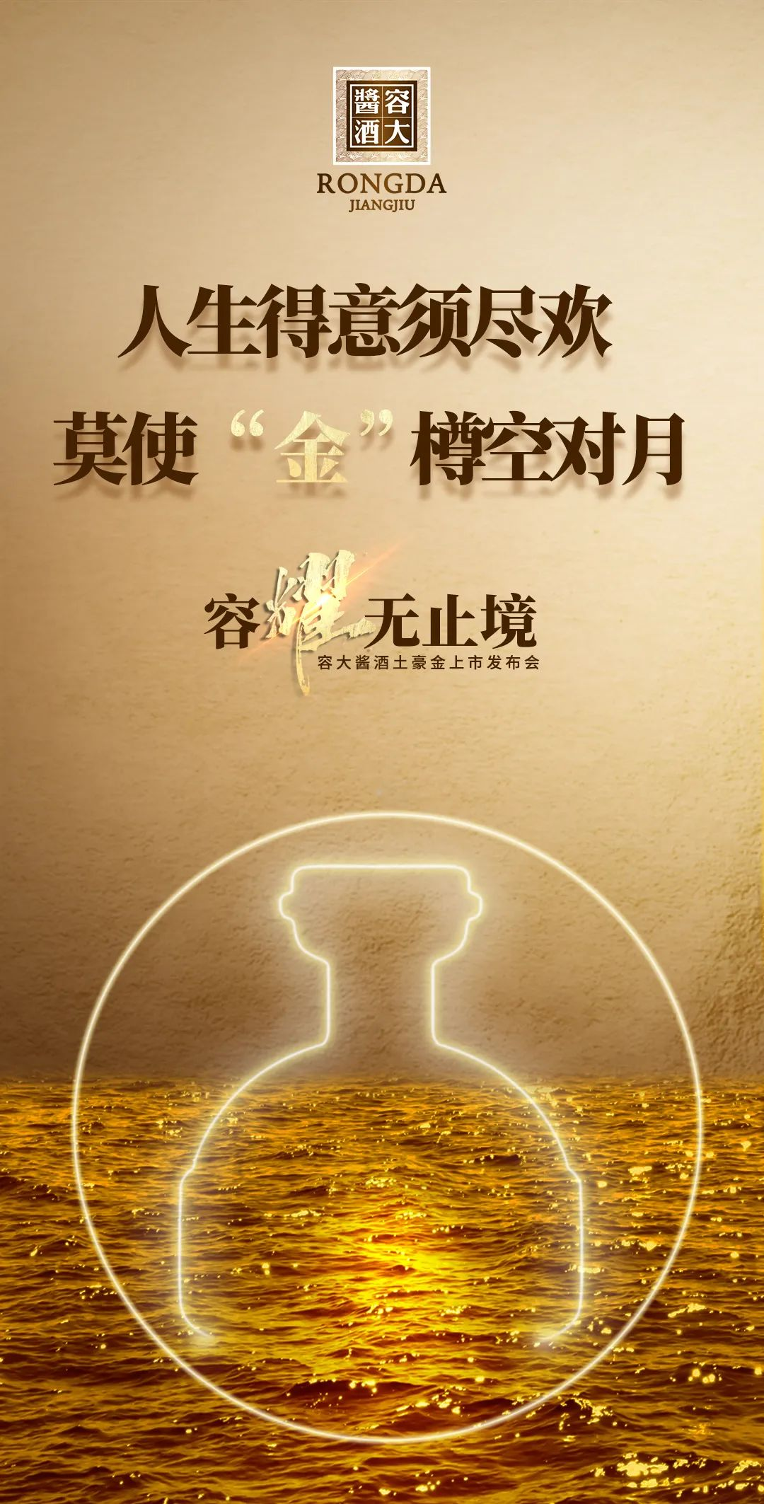 這是容大醬酒的手筆。4月下旬,容大醬酒戰(zhàn)略新品即將上市。樸實(shí)的宣傳語(yǔ),透露出其口糧醬酒的市場(chǎng)定位;奢華的土豪金顏色,又給人無(wú)限遐想,讓人對(duì)其品質(zhì)有了更多期待。
