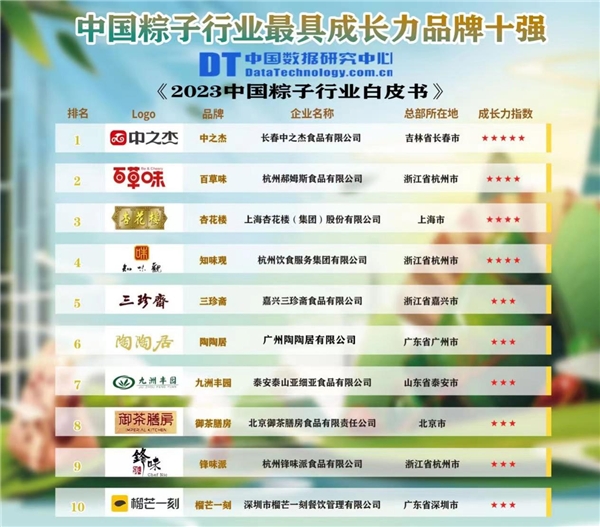 6月14日,中國數(shù)據(jù)研究中心發(fā)布“2023中國粽子行業(yè)最具成長(zhǎng)力品牌十強(qiáng)榜”,中之杰躋身榜單第一名,上榜的還有百草味、杏花樓等知名粽子品牌。