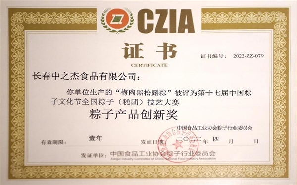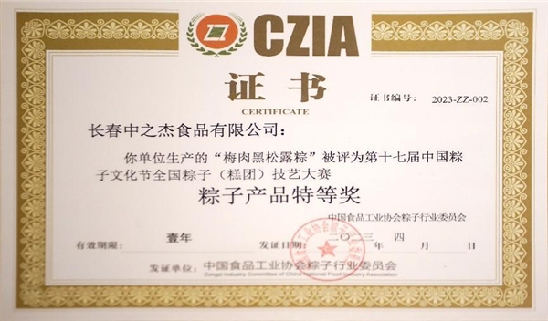 2021年,由中國食品行業(yè)協(xié)會(huì)舉辦的第16屆中國粽子文化節(jié)頒獎(jiǎng)儀式上,中之杰“藜麥大黃米粽”獲得最佳創(chuàng)新獎(jiǎng)、“藜麥大肉粽”獲得一等獎(jiǎng)、“藜麥大黃米湯圓”獲得特等獎(jiǎng),可謂是滿譽(yù)而歸。并且這已經(jīng)是中之杰在中國粽子文化節(jié)上連續(xù)5年蟬聯(lián)最高榮譽(yù)。