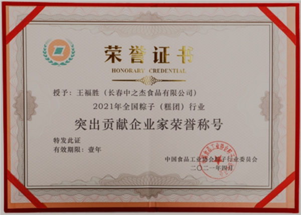 有鑒于中之杰長(zhǎng)久以來對(duì)弘揚(yáng)粽子文化事業(yè)的貢獻(xiàn),在2021年,中之杰董事長(zhǎng)王福勝先生獲得機(jī)構(gòu)頒發(fā)的“突出貢獻(xiàn)企業(yè)家”稱號(hào),體現(xiàn)出中之杰在行業(yè)內(nèi)的領(lǐng)軍實(shí)力和頂流水平。王福勝還帶領(lǐng)中之杰分別榮獲 “長(zhǎng)春民營經(jīng)濟(jì)突出貢獻(xiàn)企業(yè)”和“民營經(jīng)濟(jì)突出貢獻(xiàn)企業(yè)家”等榮譽(yù)。同時(shí),王福勝還擔(dān)任中國食品工業(yè)協(xié)會(huì)粽子行業(yè)委員會(huì)會(huì)長(zhǎng)職務(wù),為行業(yè)發(fā)展盡職盡責(zé)。