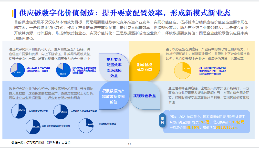 目前供應(yīng)鏈發(fā)展不僅僅以降本增效為目標(biāo),而是需要通過數(shù)字化變革推進(jìn)產(chǎn)業(yè)變革,實現(xiàn)價值創(chuàng)造。億邦智庫總結(jié)供應(yīng)鏈價值創(chuàng)造主要表現(xiàn)在四方面,一是通過集約化方式,整合全產(chǎn)業(yè)鏈資源并重新配置,提升要素配置效率,創(chuàng)造規(guī)模效益,助力產(chǎn)業(yè)鏈企業(yè)做強做大;二是核心企業(yè)開放其資源,對外服務(wù),形成新模式新業(yè)態(tài),實現(xiàn)價值轉(zhuǎn)化;三是數(shù)據(jù)逐漸成為企業(yè)資產(chǎn),釋放數(shù)據(jù)要素價值;四是企業(yè)建設(shè)綠色供應(yīng)鏈中實現(xiàn)綠色收益。