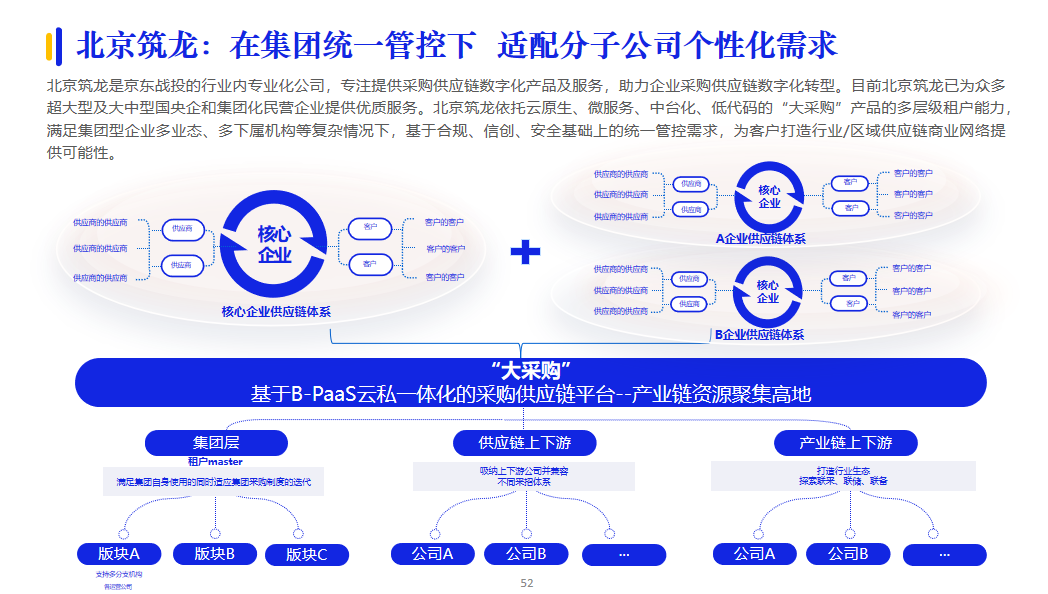 針對企業(yè)既要滿足標(biāo)準(zhǔn)化,又要滿足定制化業(yè)務(wù)需求,PaaS提供的服務(wù)更具有拓展性、集中性、適配性更強。北京筑龍基于多租戶體系,構(gòu)建了大采購云私一體化B-PaaS平臺,既滿足多層級集中管理管控需求,又為下屬管理及執(zhí)行機構(gòu)提供更多個性化、自主性選擇,進(jìn)而適應(yīng)集團多元化和業(yè)務(wù)單元專業(yè)化發(fā)展。