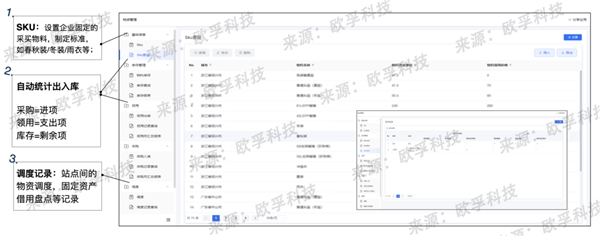 歐孚科技運(yùn)用低代碼技術(shù)搭建了“物資進(jìn)-出項(xiàng)“管理模塊。該模塊包括搭建SKU庫(kù),對(duì)物資物料進(jìn)行統(tǒng)一定義;配置采購(gòu)調(diào)度的表單公式,使區(qū)域站點(diǎn)能根據(jù)實(shí)際領(lǐng)用情況進(jìn)行填寫(xiě);根據(jù)各站點(diǎn)領(lǐng)用數(shù)據(jù),快速統(tǒng)計(jì)物料成本并進(jìn)行庫(kù)存盤(pán)點(diǎn)管理。