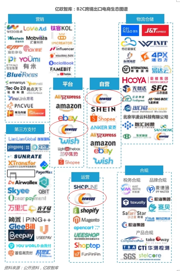 2023年國內(nèi)知名研究機(jī)構(gòu)億歐發(fā)布權(quán)威報(bào)告,其中談到出口跨境電商的生態(tài)建設(shè)一直處于較為單點(diǎn)部署的狀態(tài),獨(dú)立的生態(tài)伙伴解決獨(dú)立的問題。構(gòu)建屬于自己的生態(tài)競爭壁壘,需要尋找能夠?qū)⒏鳝h(huán)節(jié)的生態(tài)服務(wù)串聯(lián)起來的媒介,這個(gè)媒介就是第三方平臺。如亞馬遜、新蛋 、易貝等第三方平臺,其具有足夠健全完善的生態(tài)服務(wù)體系,覆蓋從建站、營銷、倉儲、物流、運(yùn)營、支付、供應(yīng)鏈管理各環(huán)節(jié)服務(wù),在注重特殊性、精細(xì)化的同時(shí)滿足合規(guī)需求;同時(shí)依靠平臺的規(guī)模性,能夠形成較好 的議價(jià)能力,提供性價(jià)比更高、更為可靠的服務(wù)。