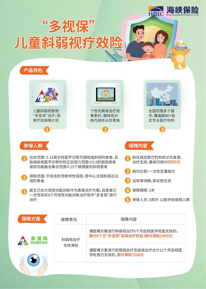 弱視和斜視作為兒童眼科的常見疾病,是導(dǎo)致兒童視覺障礙的主要原因,不僅影響兒童的正常視覺功能,對生活學(xué)習(xí)造成困擾,甚至影響未來的工作能力,孩子一旦診斷為斜弱視應(yīng)及早診治。然而,受到斜弱視本身治療周期長、收效慢、易復(fù)發(fā)、治療花費多等特點的影響,對于孩子斜弱視的治療,許多家長顧慮重重,治療信心也不足,可能更有甚者會因為錯誤的認知或者為了單純省錢而選擇了不適宜孩子實際病情的治療方法,最后耽誤了孩子病情,悔之晚矣。那么是否有一款專門針對兒童斜弱視的產(chǎn)品,既可以有效治療疾病受到專家權(quán)威認可,又可以讓孩子開心愉悅治療提高依從性,還可以對治療效果進行保駕護航呢?相信這是絕大多數(shù)斜弱視患兒家長心中一直期待的完美方案,現(xiàn)在“多視?!钡臋M空出世終于讓家長們的期待夢想成真。視景醫(yī)療一直堅持“以患者為中心,以療效為導(dǎo)向”的初心,攜專業(yè)團隊與海峽保險共同推出全球商保領(lǐng)域首個兒童斜弱視療效險產(chǎn)品“多視?!?#xff0c;為我國兒童斜弱視患者及家庭帶來更好的治療保障選擇。