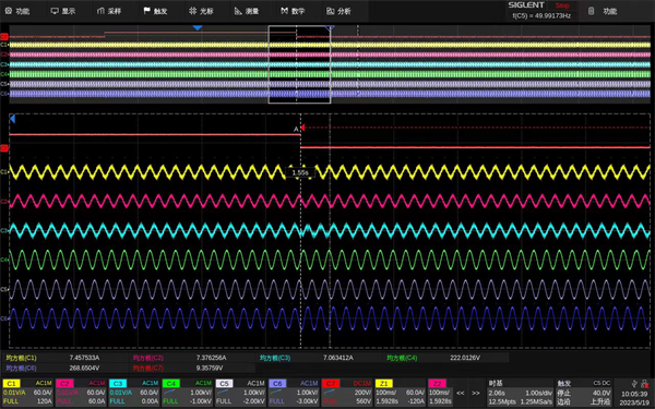 ·三相交流電分析,三相交流電廣泛應(yīng)用于需要高能效或大功率的機(jī)電設(shè)備,如三相逆變器、電機(jī)、驅(qū)動器等。逆變器廣泛應(yīng)用于家電、太陽能光伏發(fā)電、風(fēng)能發(fā)電等,而在諸多汽車系統(tǒng)中,主驅(qū)、水泵、油箱冷卻系統(tǒng)都是由三相電所控制,對這些設(shè)備進(jìn)行功率分析和電能質(zhì)量測量必不可少。使用SDS6000 Pro分析三相電時,其中3路接高壓差分探頭測量電壓,3路接電流探頭測量電流,這樣不僅能直接觀測到實(shí)時波形,還能利用數(shù)學(xué)運(yùn)算進(jìn)行各種信號處理得到電流有效值、視在功率、波峰因數(shù)、諧波失真等參數(shù)。