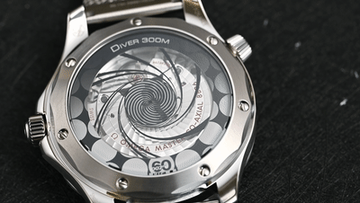 海馬300米“詹姆斯·邦德60周年紀(jì)念款”腕表的盤面,使用激光雕刻的波紋圖案,這一造型和上世紀(jì)90年代的早期海馬300米腕表保持一致,但取消了日歷。需要注意的是,新款腕表的秒針使用了“棒棒糖”秒針,其在歐米茄古董腕表中經(jīng)常出現(xiàn),是歐米茄復(fù)古風(fēng)格的一個(gè)特征。在售的海馬300腕表和2015年的《007:幽靈黨》中,詹姆斯·邦德佩戴的歐米茄海馬300腕表(注意:海馬300和海馬300米不是同一枚腕表)中同樣帶有罕見的“棒棒糖”秒針。