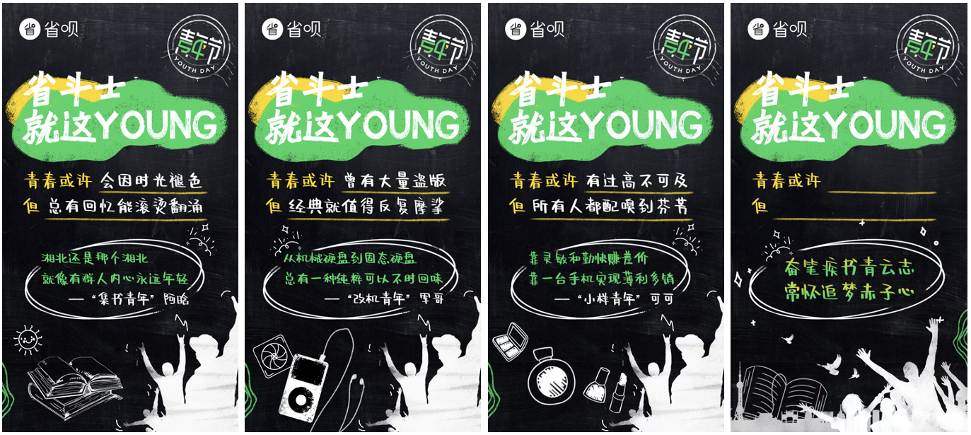 風(fēng)好正是揚帆時,策馬揚鞭再奮蹄。和集書青年阿晗、改機青年軍哥、小樣青年可可這樣將愛好做成生意的人還有很多,他們也是無數(shù)年輕追夢人的代表,有著這個時代后浪群體的可貴品質(zhì)。恰逢五四青年節(jié),數(shù)字化優(yōu)惠服務(wù)平臺省唄也為這些年輕的“省斗士”歡呼喝彩,一組#省斗士 就這YOUNG#的海報,不僅描繪出上述青年代表的風(fēng)貌,還以“青春或許_______,但_______”的句式引發(fā)網(wǎng)友的共鳴,激發(fā)年輕人表達內(nèi)心炙熱,以真誠博取喝彩與鼓勵?!扒啻夯蛟S稍縱即逝,但造就了全新的自己”、“ 青春或許是這白開水一樣淡的日子,但更多的還是相互成就和相互溫暖”、……短短半天不到,話題閱讀量就已突破1600萬。