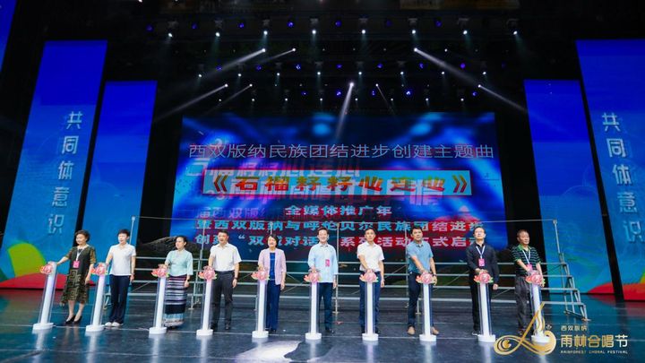 開幕式上,南疆與北疆,西雙版納與呼倫貝爾,以“中華民族一家親,同心共筑中國夢”為總目標(biāo),以首屆西雙版納雨林合唱節(jié)為契機(jī),開啟兩地“雙城(民族團(tuán)結(jié))對話”,打造“民族團(tuán)結(jié)+文化旅游”創(chuàng)新發(fā)展模式。中共西雙版納州委副書記、州委統(tǒng)戰(zhàn)部部長王嘉玲等領(lǐng)導(dǎo)為“西雙版納民族團(tuán)結(jié)進(jìn)步創(chuàng)建主題曲《石榴籽籽心連心》全媒體推廣年、西雙版納與呼倫貝爾民族團(tuán)結(jié)進(jìn)步創(chuàng)建“雙城對話”系列活動”進(jìn)行了創(chuàng)意啟動。