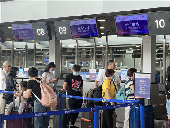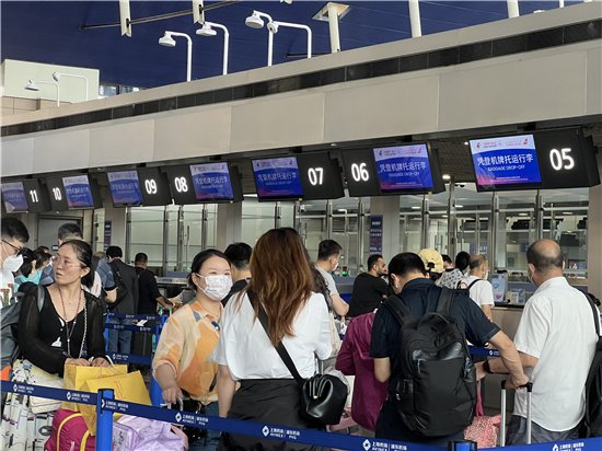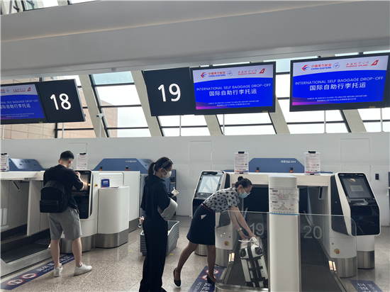 暑運期間客流上升,東航充分發(fā)揮上海虹橋、浦東兩場候機樓國內(nèi)、國際值機區(qū)自助值機設備和自助行李托運設備作用,在客流高峰時段,對排長隊的旅客進行分流。