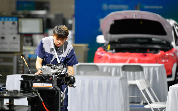 在天津舉行的首屆世界職業(yè)院校技能大賽上,參賽選手在進(jìn)行發(fā)動(dòng)機(jī)拆卸維護(hù)展演。