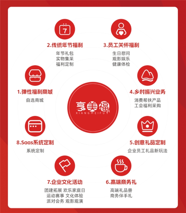 享美福除了企業(yè)活動(dòng)定制之外,還有年節(jié)禮包、Saas系統(tǒng)定制、鄉(xiāng)村振興等業(yè)務(wù)。通過(guò)全方位、多角度的企業(yè)福利方案打造,傳遞企業(yè)文化,展示企業(yè)的人文關(guān)懷。