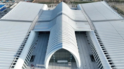 從空中俯瞰,會展中心整體設計以鳳凰形象為靈感,以“羽飛長空、科創(chuàng)未來”為設計理念,采用由屋脊向兩側舒展的“中軸對稱、輕盈飄逸”設計造型寓意“臨空之翼、展翅騰飛”,表達科技引領經濟騰飛,未來發(fā)展青云直上的美好祝愿。
