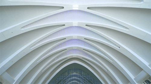 登錄廳“鳥喙”造型凈高34m,頂端懸挑長度達到6m。梁柱縱橫交錯、網狀交織。八局裝飾采用裝配式設計施工方法,現場組裝、單元吊裝、多條安裝線流水施工,完成1400塊雙曲異形超長鋁板快速安裝,輔以9953盞Dmax-512系統(tǒng)RGBW調光燈,營造流光溢彩的視覺效果,讓建筑空間更具藝術特性。