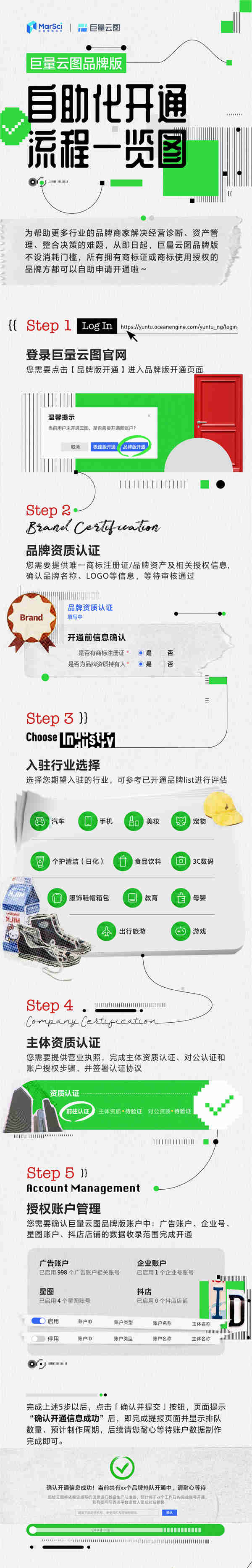 為幫助更多行業(yè)的品牌商家解決經(jīng)營、管理、決策難題,巨量云圖品牌版自助化開通能力已上線,不設(shè)消耗門檻、無需直客銷售提報,所有持有商標證或商標使用授權(quán)的品牌,在登陸官網(wǎng)后,均可根據(jù)流程指引進行自助化開通。