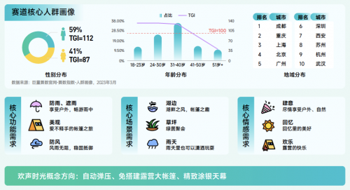 帳篷賽道解讀:該賽道抖音2022年搜索量同比增長(zhǎng)228.6%,遠(yuǎn)高于行業(yè)整體水平。該賽道的興趣群體以 31-40 歲的男性為主,主要分布地區(qū)涵蓋多個(gè)熱門旅游城市。隨著生活水平的提高和對(duì)自然休閑需求的增加,多功能帳篷在未來將更受歡迎,防雨、美觀和防風(fēng)等多重特性將滿足人們對(duì)于舒適和便利的需求。除此之外,在技術(shù)創(chuàng)新、多樣化產(chǎn)品、個(gè)性化定制、環(huán)??沙掷m(xù)發(fā)展等趨勢(shì)上,這一領(lǐng)域?qū)⒂袕V闊的市場(chǎng)前景。