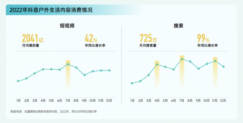 2022年戶外生活相關(guān)內(nèi)容在抖音上的受歡迎程度持續(xù)增長(zhǎng),月均播放量高達(dá) 2041 億次,同比增長(zhǎng) 42%。除短視頻種草外,用戶主動(dòng)搜索戶外生活內(nèi)容的意愿也更加強(qiáng)烈,月均搜索量達(dá)到 725 萬(wàn)次,同比增長(zhǎng) 99%。