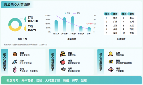 沖浪賽道解讀:2022年搜索量同比增長(zhǎng)100.7% 。用戶以男性為主,集中在北上廣一線城市。24-40 歲人群對(duì)沖浪潛水更感興趣。相對(duì)來說,對(duì)于沖浪潛水用戶更注重便捷、排水等功能。未來,隨著技術(shù)的發(fā)展和人們對(duì)海洋環(huán)境保護(hù)意識(shí)的增強(qiáng),沖浪運(yùn)動(dòng)將更加注重舒適、安全和環(huán)保,并可能推出更具創(chuàng)新性的裝備,產(chǎn)生新的活動(dòng)形式。