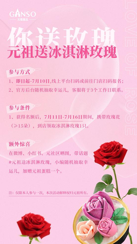 即日起至7月10日,線上平臺(tái)掃碼或前往元祖門店掃碼報(bào)名即可參與。官方后臺(tái)會(huì)隨機(jī)抽取幸運(yùn)兒,獲得名額后7月11日-7月16日攜玫瑰花到店領(lǐng)取冰淇淋玫瑰,為愛(ài)人獻(xiàn)上夏日專屬的甜蜜美味。參與活動(dòng)后,在微博、小紅書(shū)、元社區(qū)曬圖,帶話題#元祖送冰淇淋玫瑰#,還有機(jī)會(huì)獲得元祖蛋糕一個(gè)。