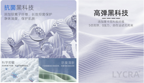 更系統(tǒng)來講,VOVOS 的“黑科技”大概有以下幾點:① 無痕工藝:運用德國漢高膠水,良好的粘接強度和耐熱性支撐性強,貼合無痕。② 萊卡面料:極大提高面料的彈性和延展性,與其他纖維對比伸展度可以達到500%。貼合人體,束縛力小。除此之外,銀離子、石墨烯面料和涼感紗織等科技也能著重提升抗菌、透氣與涼感和防紫外線等功能。