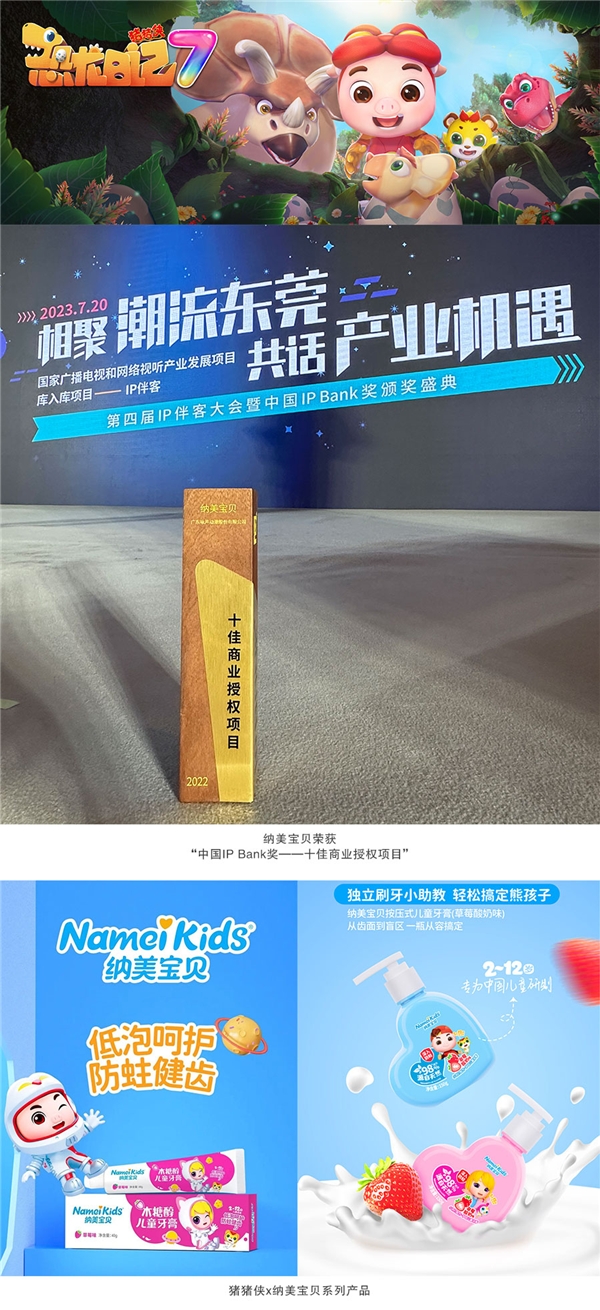其中,豬豬俠攜手納美寶貝,開發(fā)了20多款備受消費者青睞的兒童口腔護理產品,并在沃爾瑪、大潤發(fā)、永輝等全國優(yōu)質商超上線,該系列產品在兒童牙膏/牙刷品類實現細分領域市場排名前十,榮獲“中國IP Bank獎——十佳商業(yè)授權項目”。目前,詠聲動漫旗下各大IP授權合作覆蓋玩具、食品、文具、家居日化用品、游戲、出版物、主題業(yè)態(tài)等共計12個行業(yè),衍生品品類達上百種,年零售市值超50億元。