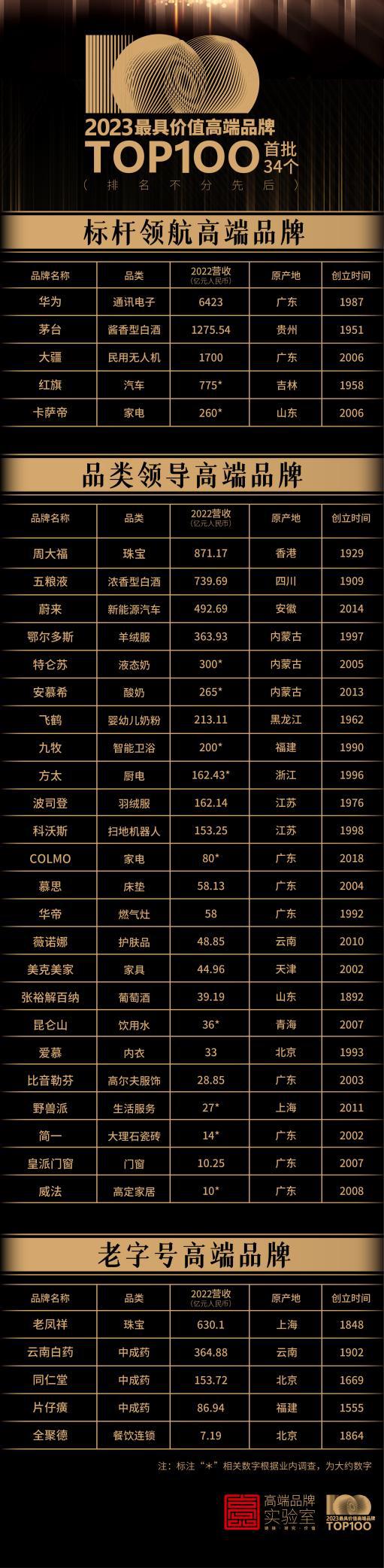 5月11日,由中國公務(wù)航空集團獨家冠名的“2023最具價值高端品牌TOP100”榜單正式發(fā)布。這份號稱“國內(nèi)首家”的榜單上,茅臺、華為、卡薩帝、紅旗、慕思、飛鶴等34個品牌進入了TOP100首批名單。