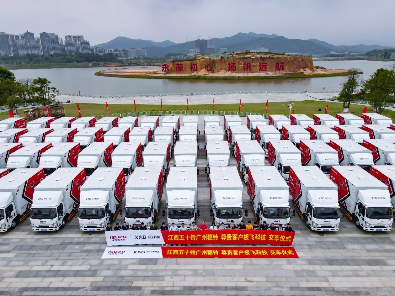 3月22日,隨著指揮人的一聲發(fā)號指令,112臺江西五十鈴翼放ES7從廣州中新知識城公園浩浩蕩蕩出發(fā),駛向它們的新家——極飛科技公司總部,踏上智慧農(nóng)業(yè)的征途。