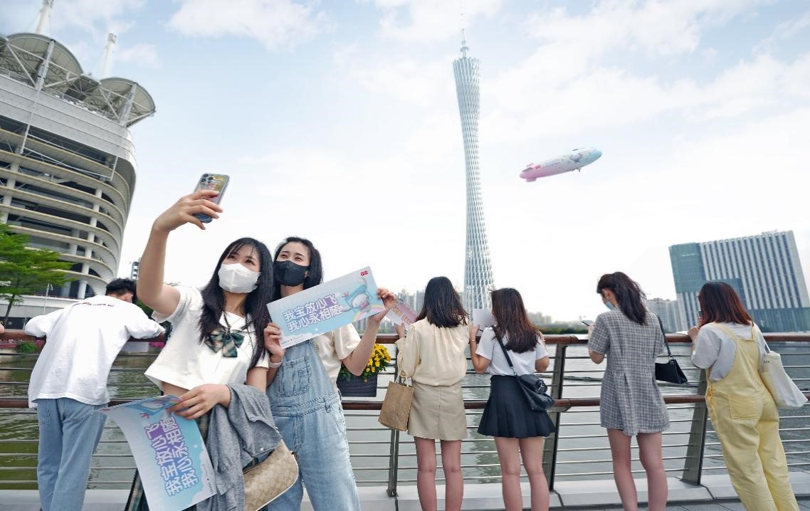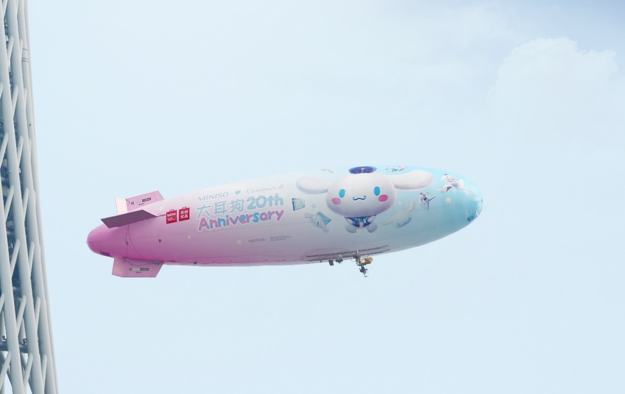 在“大耳狗20周年”期間,名創(chuàng)優(yōu)品于3月19日當天獨家打造了一架豪華飛艇,把“大耳狗寵上天”。這架飛艇圍繞廣州塔、海心橋、獵德大橋環(huán)繞飛行,從下往上看飛艇的外觀,正是大耳狗20周年慶主題海報。隨著飛艇乘風而上,大耳狗仿佛躲進輕紗包裹般的云端里,沖著地面的人打趣逗樂。