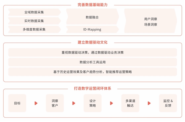 總結(jié)來(lái)說(shuō),新國(guó)貨美妝品牌在提升數(shù)字化運(yùn)營(yíng)能力上應(yīng)把握三個(gè)關(guān)鍵舉措:完善數(shù)據(jù)基礎(chǔ)能力、建立數(shù)據(jù)驅(qū)動(dòng)文化、打造數(shù)字運(yùn)營(yíng)閉環(huán)體系,如下:
