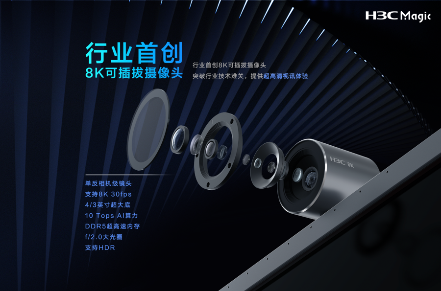 值得關(guān)注的是,行業(yè)首創(chuàng)的8K可插拔攝像頭,采用遠(yuǎn)超傳統(tǒng)會(huì)議一體機(jī)和手機(jī)芯片的4/3英寸超大尺寸感光傳感器,搭配無畸變非球面玻璃鏡頭與f/2.0大光圈,配備10Tops AI算力和DDR5超高速的內(nèi)存,并且能夠支持8K 30fps與HDR功能,敏銳捕捉光源信息變化的同時(shí)快速反饋完成視覺成像,保證了超高清的視訊體驗(yàn),靈動(dòng)捕捉每一幀超真感視效。同時(shí),攝像頭能夠支持即插即用功能,為高敏感行業(yè)的隱私訴求提供了更好地選擇,最大限度保障用戶信息安全。