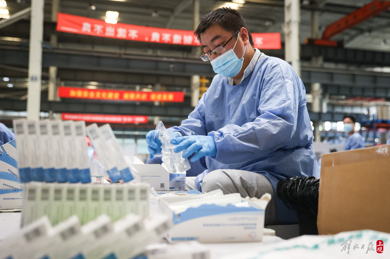 2022年4月11日,上觀新聞記者來到業(yè)績路上的寶山防疫服務(wù)包最大的分裝車間,這里原本是上海漢虹精密機(jī)械有限公司的生產(chǎn)廠房,但該廠百余名志愿者從早上八點(diǎn)就開始分批次投入到了防疫物資的分裝“流水線”作業(yè)中,一張張清單核對,一件件物資分裝,現(xiàn)場熱火朝天。