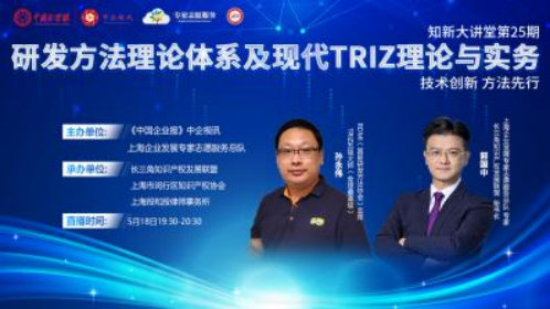5月18日,中企視訊《知新大講堂》第25期節(jié)目線上開(kāi)播。RDMI(國(guó)際研發(fā)方法協(xié)會(huì))主席、TRIZ五級(jí)大師(全球最高級(jí))、DFSS(六西格瑪設(shè)計(jì))黑帶大師孫永偉博士做客中企視訊直播間,長(zhǎng)三角知識(shí)產(chǎn)權(quán)發(fā)展聯(lián)盟秘書(shū)長(zhǎng)郭國(guó)中擔(dān)任主持人,介紹了現(xiàn)代TRIZ理論體系的組成以及它在技術(shù)創(chuàng)新、新產(chǎn)品研發(fā)、專利布局、規(guī)避、挖掘等專利戰(zhàn)略、運(yùn)用創(chuàng)新大幅降本等方面的重要作用。