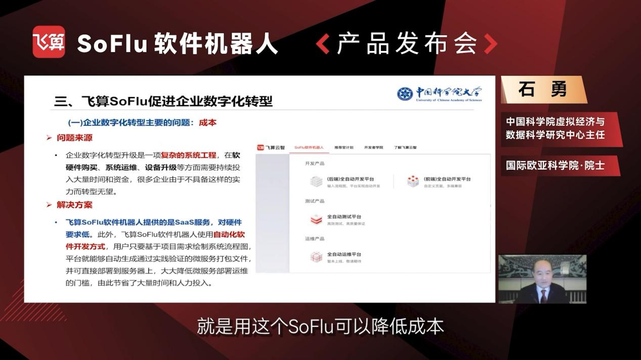 “全自動開發(fā)無疑是大勢所趨。軟件行業(yè)高度依賴人力,這導致軟件開發(fā)效率低、質量差,只有解決以上問題,企業(yè)才能順利推進數(shù)字化轉型。”飛算云智總裁、SoFlu軟件機器人的總設計師陳定瑋在發(fā)布會上表示。