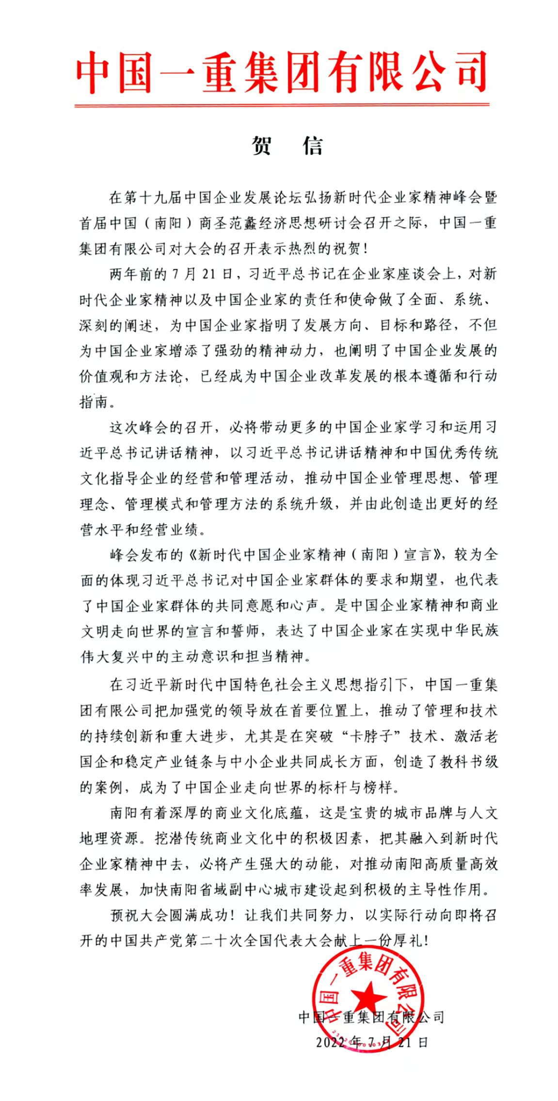 7月21日—7月22日,以“傳承中華優(yōu)秀文化,弘揚(yáng)新時代企業(yè)家精神”為主題的第十九屆中國企業(yè)發(fā)展論壇弘揚(yáng)新時代企業(yè)家精神峰會暨首屆中國(南陽)商圣范蠡經(jīng)濟(jì)文化研討會在河南省南陽市舉辦。本次研討會由中國企業(yè)聯(lián)合會、中國企業(yè)家協(xié)會、中國企業(yè)文化促進(jìn)會指導(dǎo),南陽市人民政府、《中國企業(yè)報》集團(tuán)主辦,中共南陽市委宣傳部、南陽市工業(yè)和信息化局、南陽市招商投資促進(jìn)局、南陽理工學(xué)院、南陽市宛城區(qū)人民政府協(xié)辦。《中國企業(yè)報》集團(tuán)副社長、副總裁張博宣讀中國一重集團(tuán)有限公司發(fā)來的賀信。