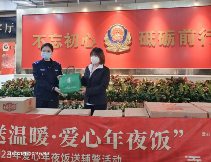 廈門綠進食品有限公司總經(jīng)理柯宏婷(右)為輔警代表贈送“松板”等具有閩南特色的“預(yù)制菜年愛心夜飯大禮包”