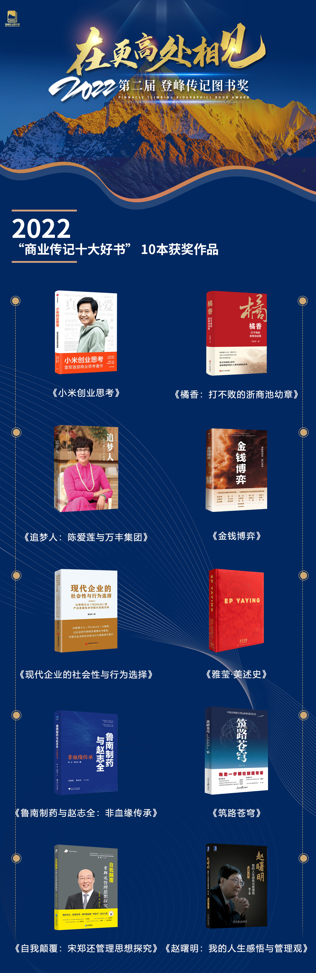 2023年1月15日,第二屆“登峰傳記圖書獎(jiǎng)”隆重揭幕。中國經(jīng)濟(jì)出版社/中國石化出版社總經(jīng)理兼總編輯毛增余、中央編譯出版社社長兼總編輯郗衛(wèi)東、中華工商聯(lián)合出版社社長李梁、當(dāng)代世界出版社社長丁云、電子工業(yè)出版社總編輯兼華信研究院院長劉九如、人民郵電出版社智元出版社總經(jīng)理繆永合、廣東經(jīng)濟(jì)出版社副總編輯王成剛、機(jī)械工業(yè)出版社/華章出版副總經(jīng)理王磊、華中科技大學(xué)出版社大眾分社社長亢博劍、企業(yè)管理出版社副社長/《企業(yè)家》雜志執(zhí)行主編王仕斌、百道新出版研究院院長/百道網(wǎng)董事長程三國、正和島總編輯陳為、《中國民商》執(zhí)行社長張立棟、中華讀書報(bào)副總編/財(cái)經(jīng)主編紅娟、《商界評(píng)論》主編唐亮、喜馬拉雅價(jià)值出版事業(yè)部總經(jīng)理陳恒達(dá)、商業(yè)傳記作家/潤商文化創(chuàng)始人陳潤擔(dān)任登峰傳記圖書獎(jiǎng)評(píng)委,共同見證了“2022十大中國商業(yè)傳記好書”和“2022十大中國圖書影響力企業(yè)”的誕生。