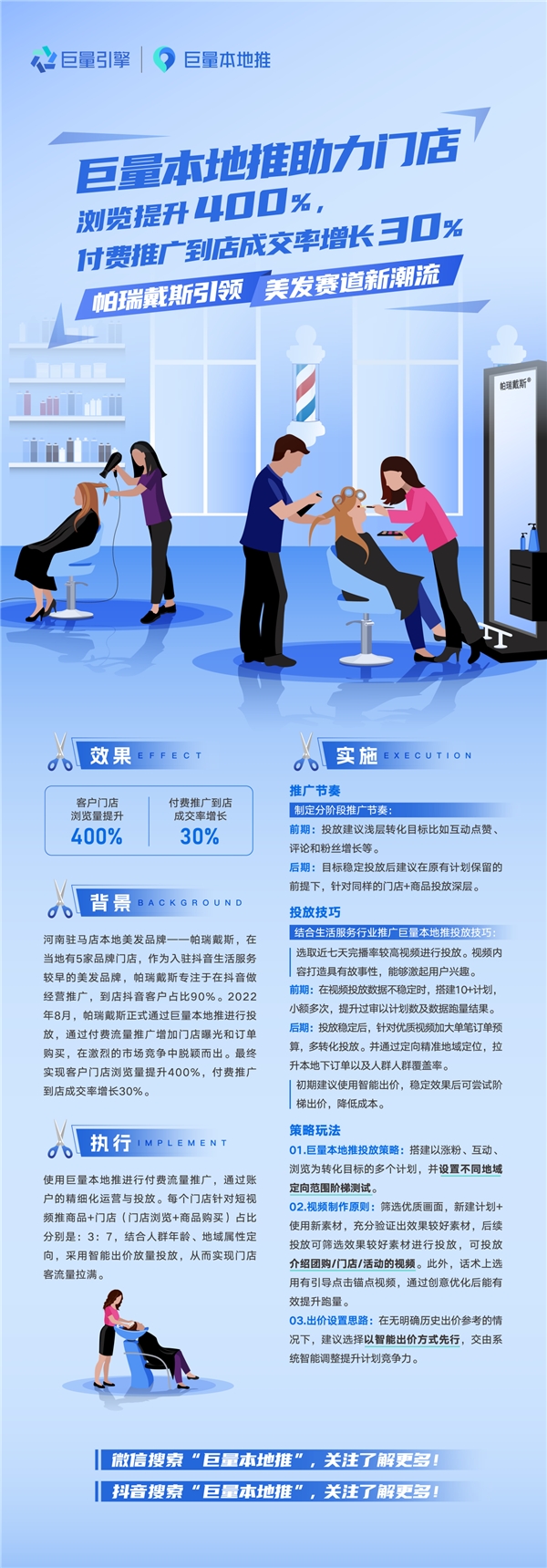 本地生意蘊(yùn)藏著巨大商機(jī),商家如何借助線上平臺(tái)或工具,挖掘更多增長(zhǎng)機(jī)會(huì)呢?「巨量本地推」第二期極星案例大賽,正式揭曉最終獲獎(jiǎng)案例榜,獲得「到綜」第一名的河南駐馬店本地美發(fā)品牌帕瑞戴斯,成功在諸多案例中脫穎而出,月均消耗提升4倍,付費(fèi)推廣到店成交率增長(zhǎng)30%,本地到店客戶源源不斷,給本地商家?guī)?lái)了一些增長(zhǎng)思路借鑒。
