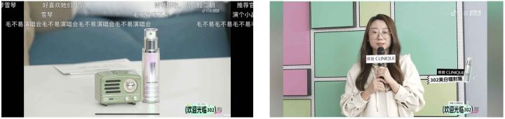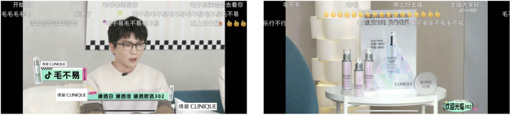 經(jīng)過(guò)前期的聲量積累,倩碧在直播環(huán)節(jié)中更為聚焦于將創(chuàng)新綜藝形式與品牌宣傳結(jié)合,通過(guò)片頭片尾廣告片、桌面產(chǎn)品擺放、嘉賓創(chuàng)意口播等形式植入品牌和產(chǎn)品形象。