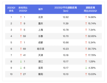 百城中55%的城市2023Q1通勤距離均有所增加,通勤距離榜TOP10城市中,九城通勤距離同比上漲,其中春、哈爾濱的同比漲幅超30%。