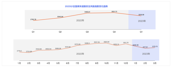 數(shù)據(jù)顯示,全國(guó)高快速路的安全險(xiǎn)指數(shù)環(huán)比2022第四季度下降8.16%,全國(guó)高快速路的危險(xiǎn)駕駛行為(即三急一超:急加速、急減速、急轉(zhuǎn)彎和超速)與2022第一季度比較,超速、急轉(zhuǎn)彎的變化趨勢(shì)一致,急加速、急減速則在2023年3月呈現(xiàn)下降向好趨勢(shì)。