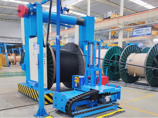 藍色自行小車把巨大的電纜軸送到既定位置,黃色的機械臂將線軸卡好,設備啟動后線纜開始自動纏繞,一盤整齊的電纜線慢慢成型。車間里,紅、黃、藍、白色的機械臂、自行小車等機械設備分工合作,有條不紊地生產。諾大的廠房中,零星行走著幾位身著藍色工裝、頭戴安全帽的工作人員。