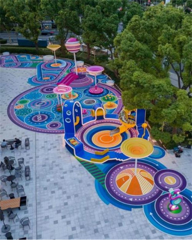 陸家嘴集團(tuán)立足于“兒童友好”理念,以想象中的“糖果世界”為靈感的項目,借助糖果手杖、棒棒糖、冰棍等兒童喜愛的糖果主題,搭建了一條條亮眼且生動的彩虹結(jié),通過巧妙結(jié)合現(xiàn)場的L形地形,不僅承載著多元的游戲活動,而且互相交錯,蜿蜒穿插形成了一系列互動性、可玩性、娛樂性極高的游玩動線。無論是1歲左右的嬰幼兒,還是14歲步入青春期,不同年齡段的孩子都可以輕松在這里找到愉快且富有挑戰(zhàn)性的游戲項目。