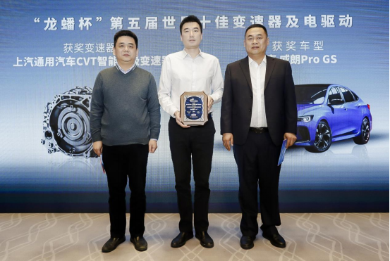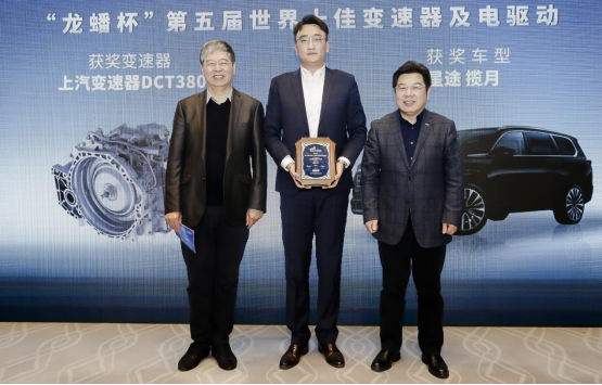 汽車評(píng)價(jià)研究院院長李慶文(左1)與中國汽車工業(yè)協(xié)會(huì)副秘書長羅軍民(右1)為上汽變速器市場營銷負(fù)責(zé)人王含東(中)頒獎(jiǎng)