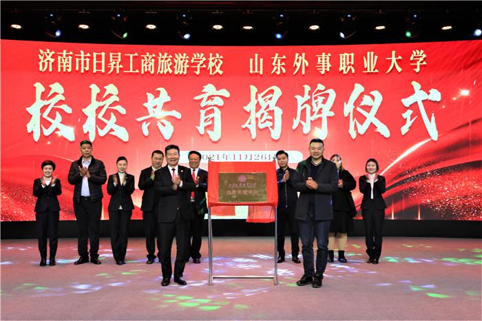 濟(jì)南市日昇工商旅游學(xué)校黨支部書記楊楠與山東外事職業(yè)大學(xué)副校長(zhǎng)孫彤宇共同為山東外事職業(yè)大學(xué)“合作共建單位”揭牌。