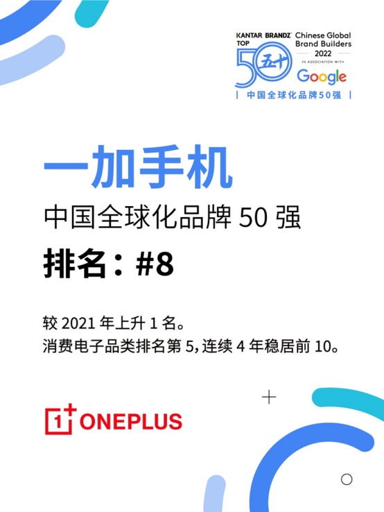 ?中國(guó)全球化品牌50強(qiáng)》。其中,一加手機(jī)排名第8,同時(shí)也在消費(fèi)電子品類(lèi)排名第5,總排名相較21年上升1名。憑借優(yōu)質(zhì)的產(chǎn)品體驗(yàn)和獨(dú)特的品牌氣質(zhì),一加手機(jī)已連續(xù)6年蟬聯(lián)該榜單,且連續(xù)4年穩(wěn)居前10。