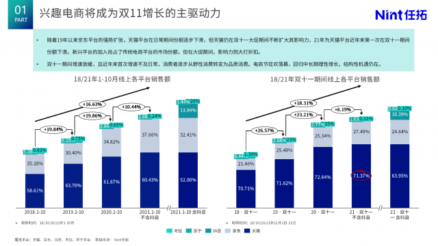興趣電商將成為雙11增長(zhǎng)的主驅(qū)動(dòng)力 回顧2018年-2021年雙11全域電商增長(zhǎng)趨勢(shì)可見(jiàn),2018年-2021年全域電商雙11銷售增長(zhǎng)逐步放緩,2021年,不含抖音銷售規(guī)模,僅維持個(gè)位數(shù)增長(zhǎng)。