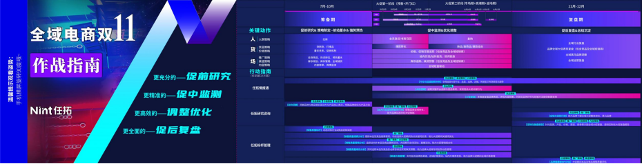 Nint任拓首次發(fā)布《雙11全域電商增長(zhǎng)作戰(zhàn)圖》,從大促籌備期、大促期到復(fù)盤期三大階段出發(fā),梳理了品牌商家核心運(yùn)營(yíng)策略,為品牌商家提供明確的行動(dòng)指南。